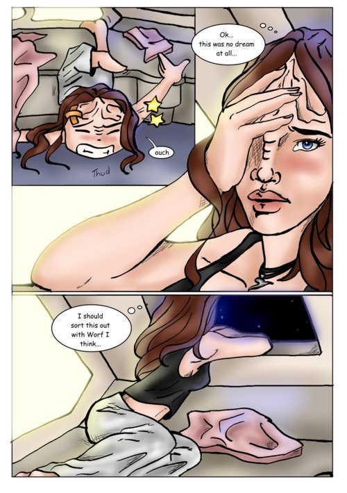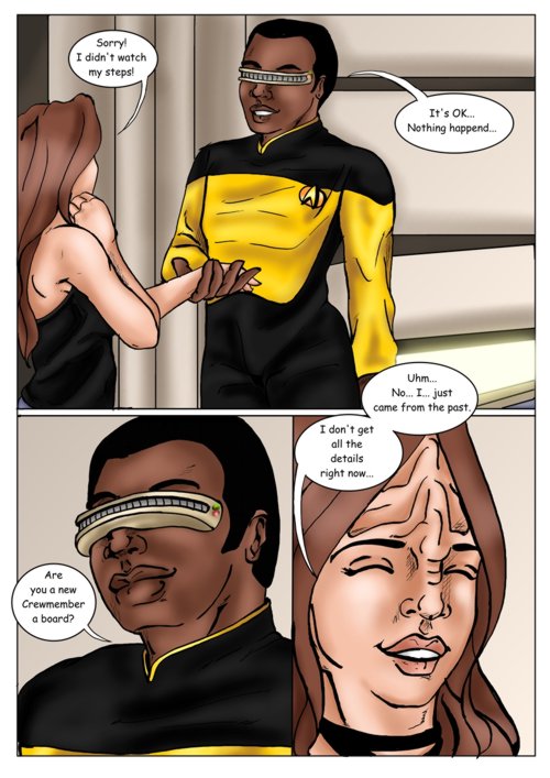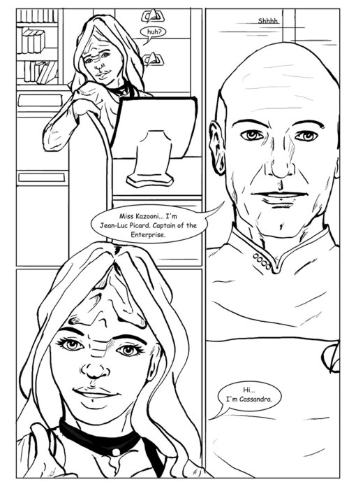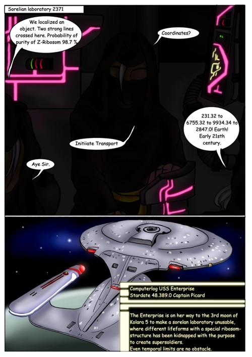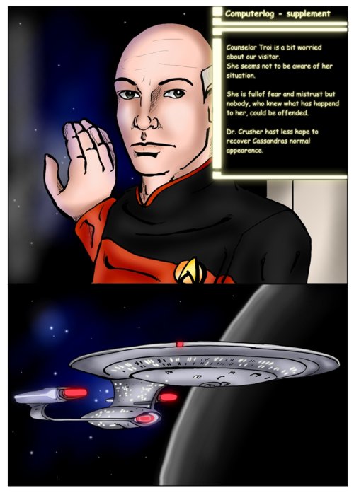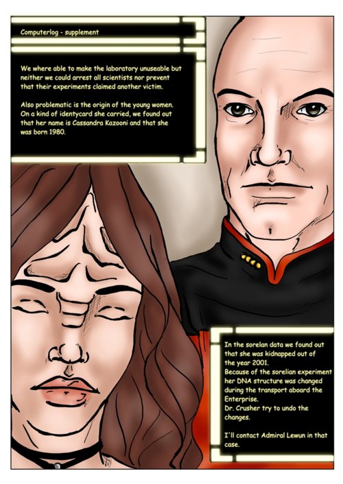 Cassandra Kazooni, a young woman, is dragged into the year 2371 by an eerie species, who call themself 'Sorelans'. Before they could do anything worse to Cass, she is rescued by Commander Riker and Lieutenant Worf.
