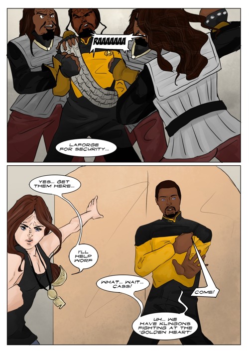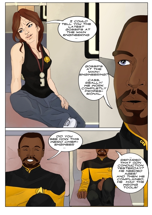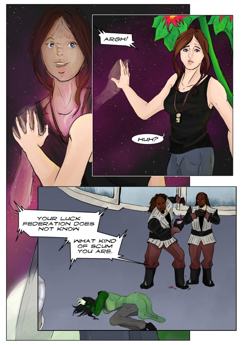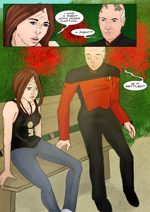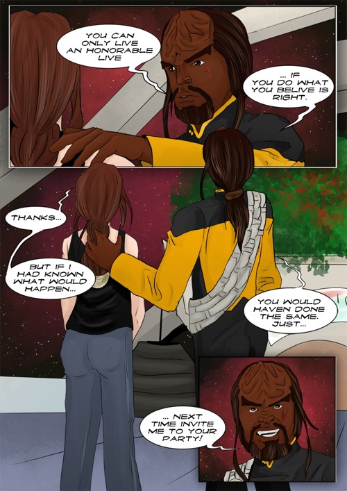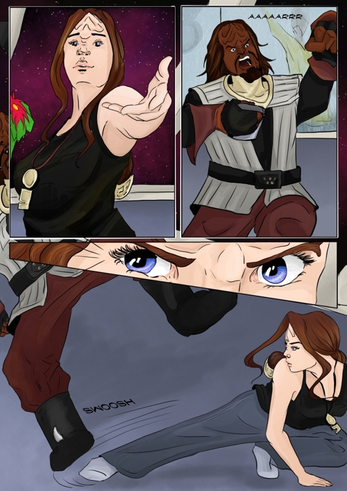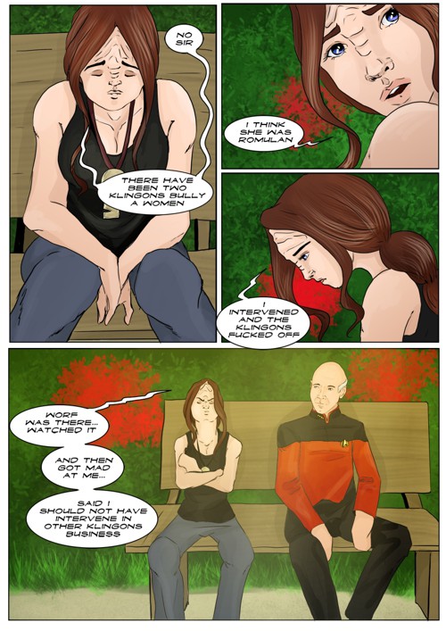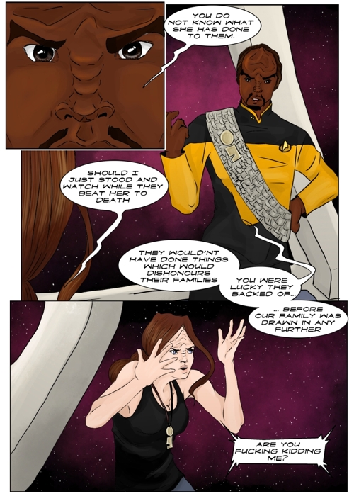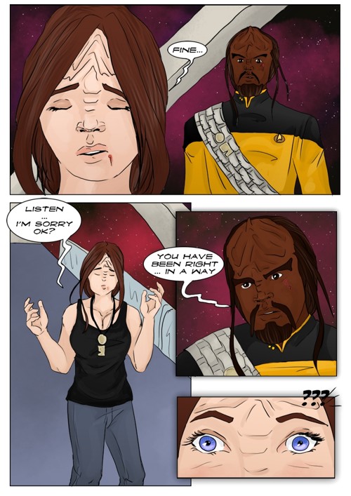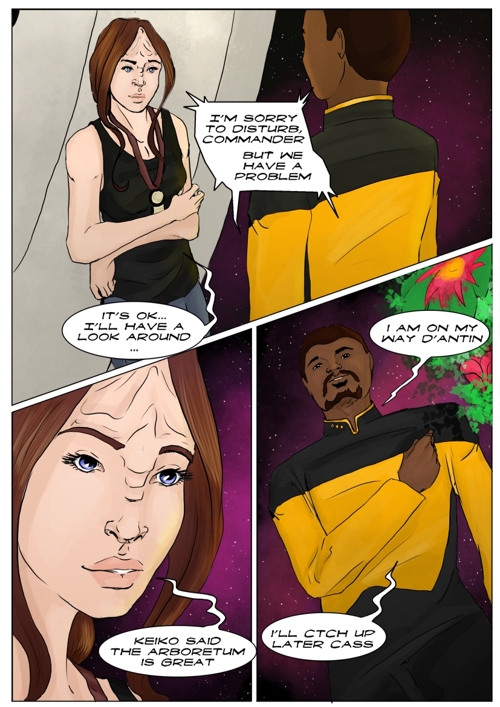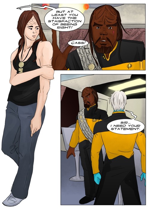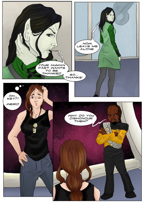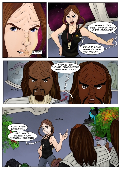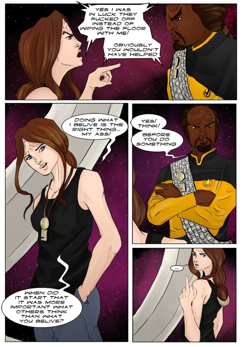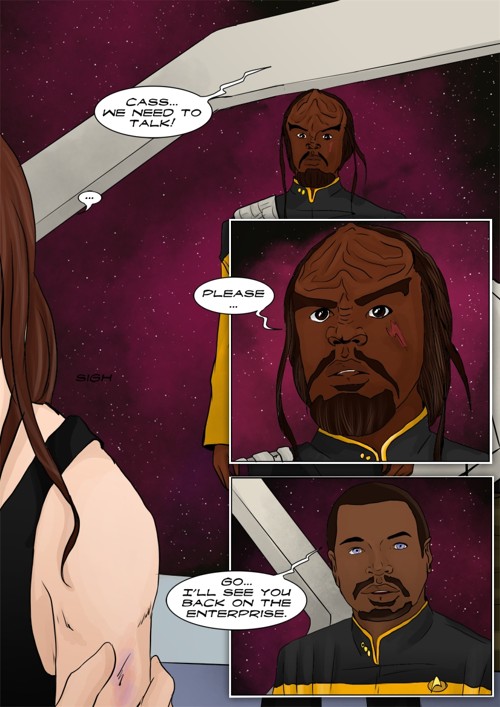 Cassandra stayed in 2371 and tries to blend in. The Enterprise stops at an Starbase for fresh supplies and routines. While Cass uses this possibility to explore the station she gets into a fight with Worf over the klingon way.