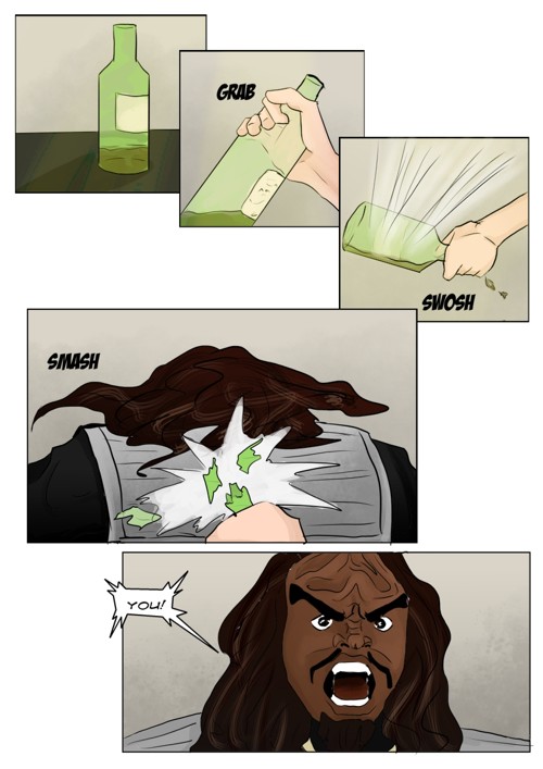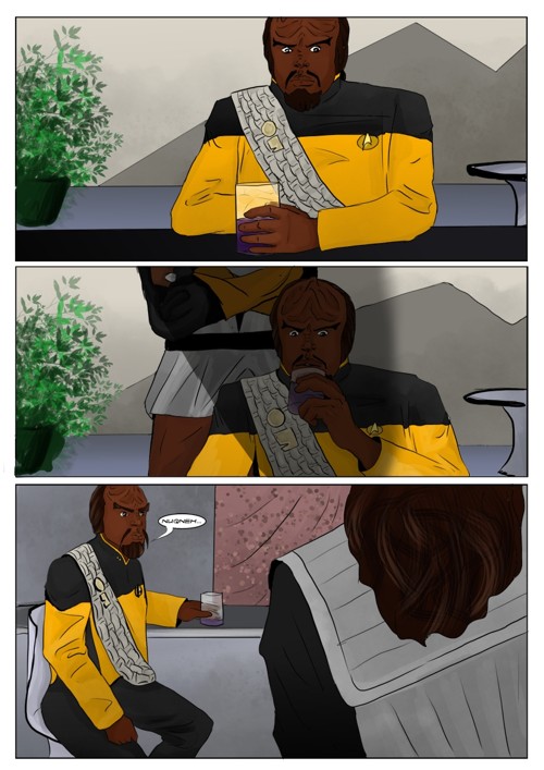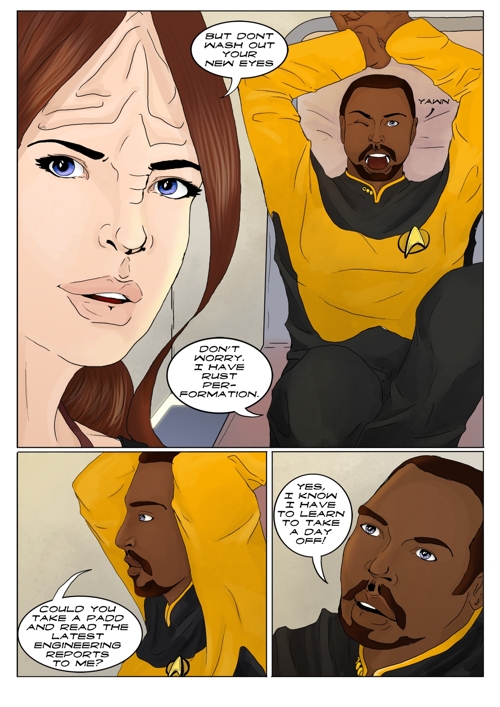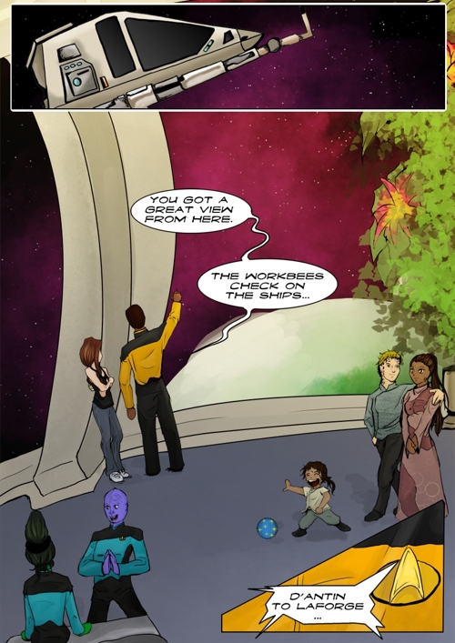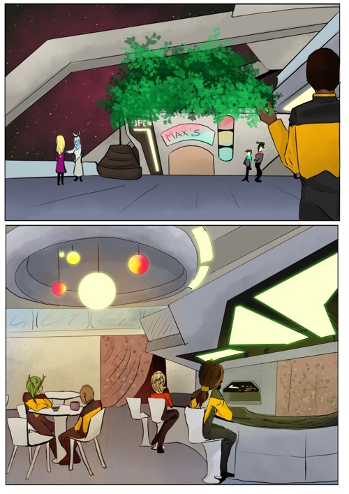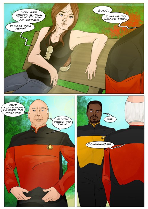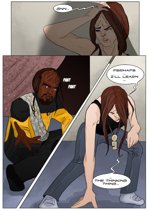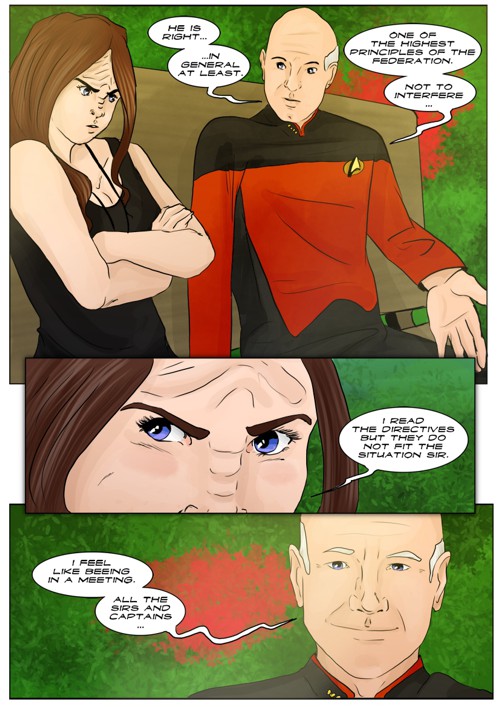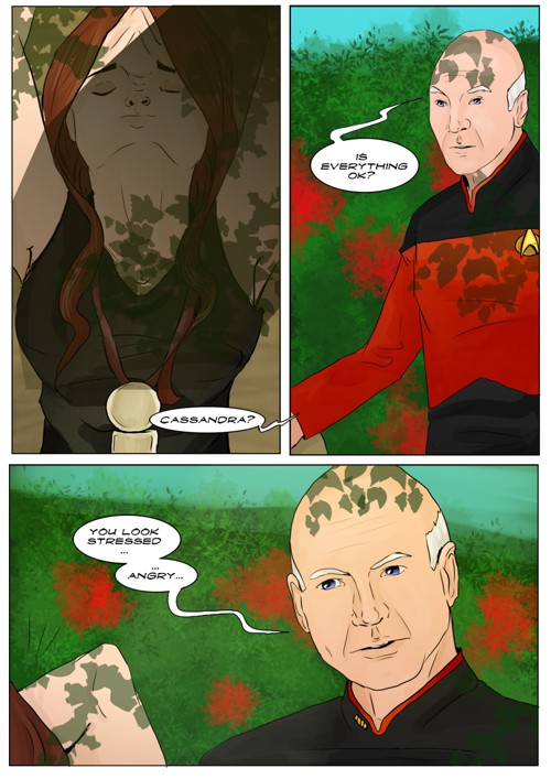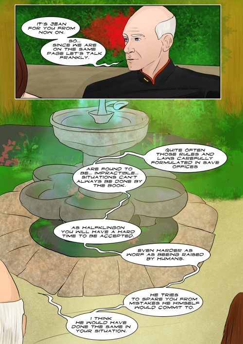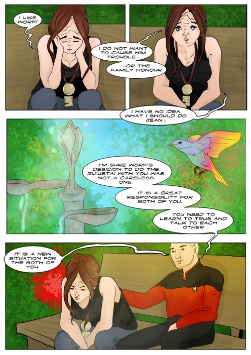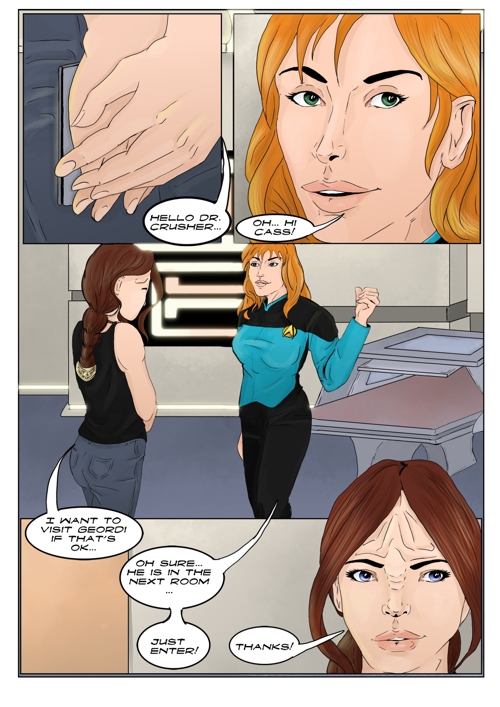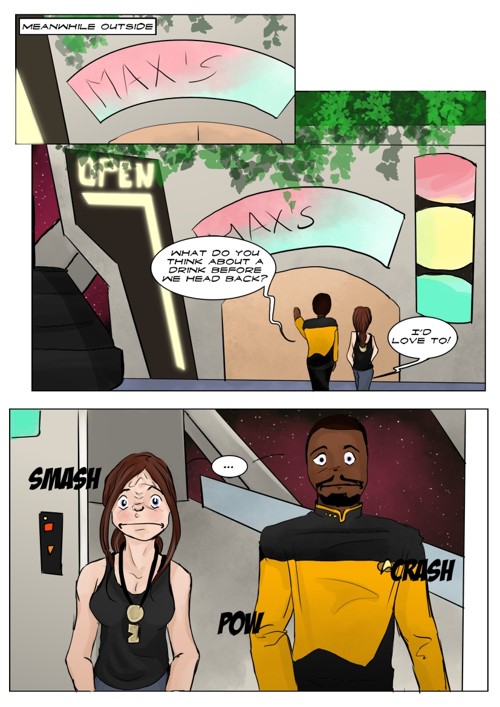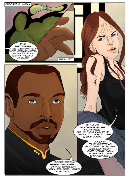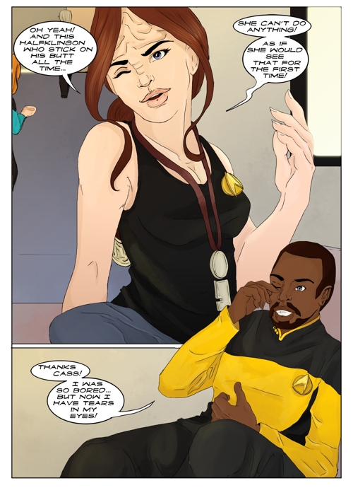 Cassandra stayed in 2371 and tries to blend in. The Enterprise stops at an Starbase for fresh supplies and routines. While Cass uses this possibility to explore the station she gets into a fight with Worf over the klingon way.
